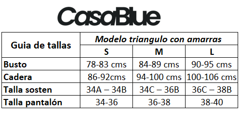 Bikini de corte triángulo resistente al agua salada y al cloro. Cuello y espalda cuentan con ajuste regulable permitiendo un calce cómodo y adaptable al cuerpo.