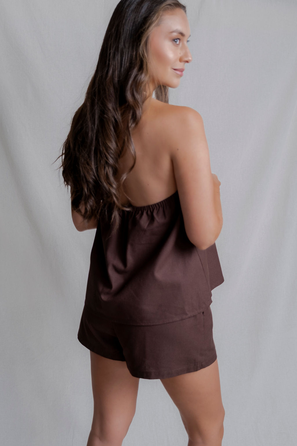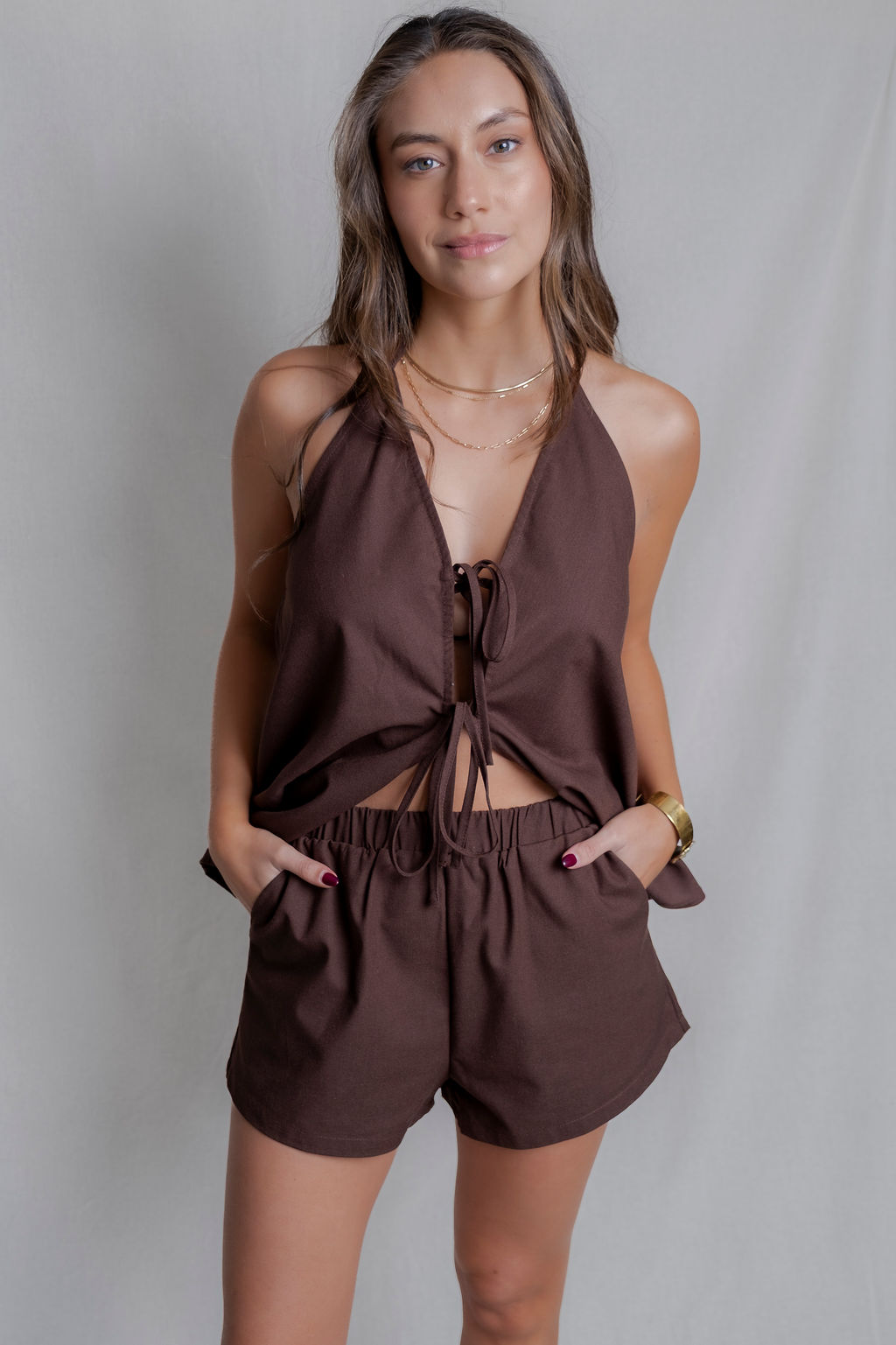 Conjunto de dos piezas confeccionado en tela ligera de algodón ideal para días cálidos. El top estilo halter con amarras y calce suelto ofrece frescura y un look relajado, mientras el short de pretina elástica asegura comodidad y versatilidad.