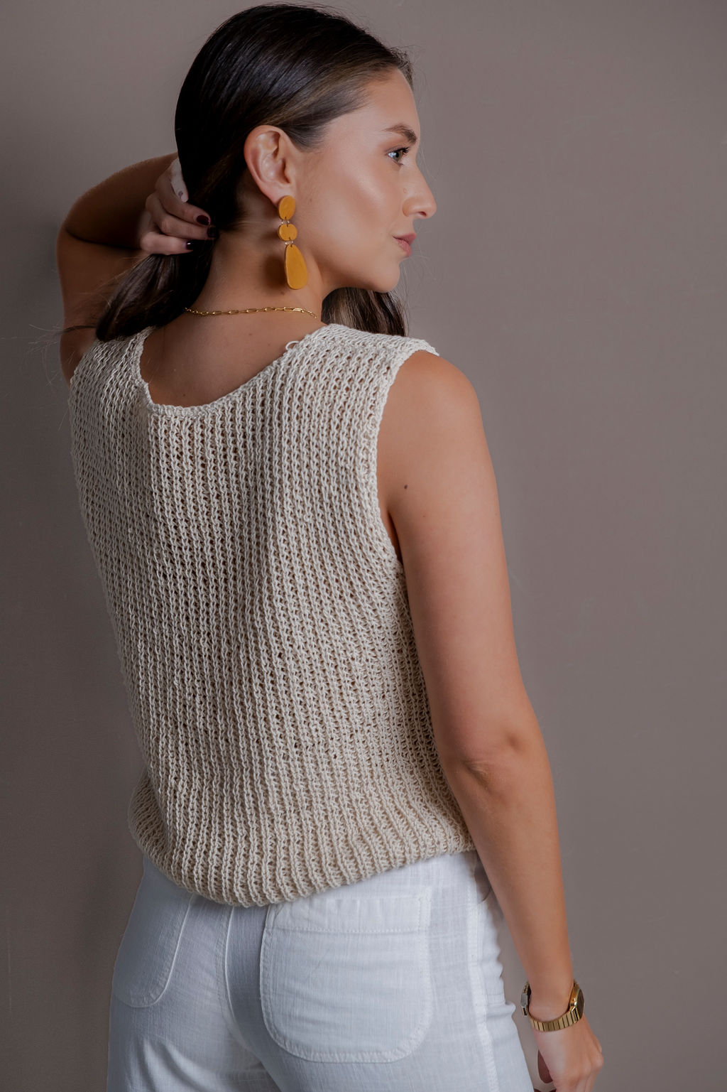 Este gilet sin mangas ha sido tejido a mano en hilo de algodón 100% natural, pensado para acompañarte todo el año. Destacan sus botones tipo piedra nácar, elegidos uno a uno para dar un acabado orgánico y luminoso.
