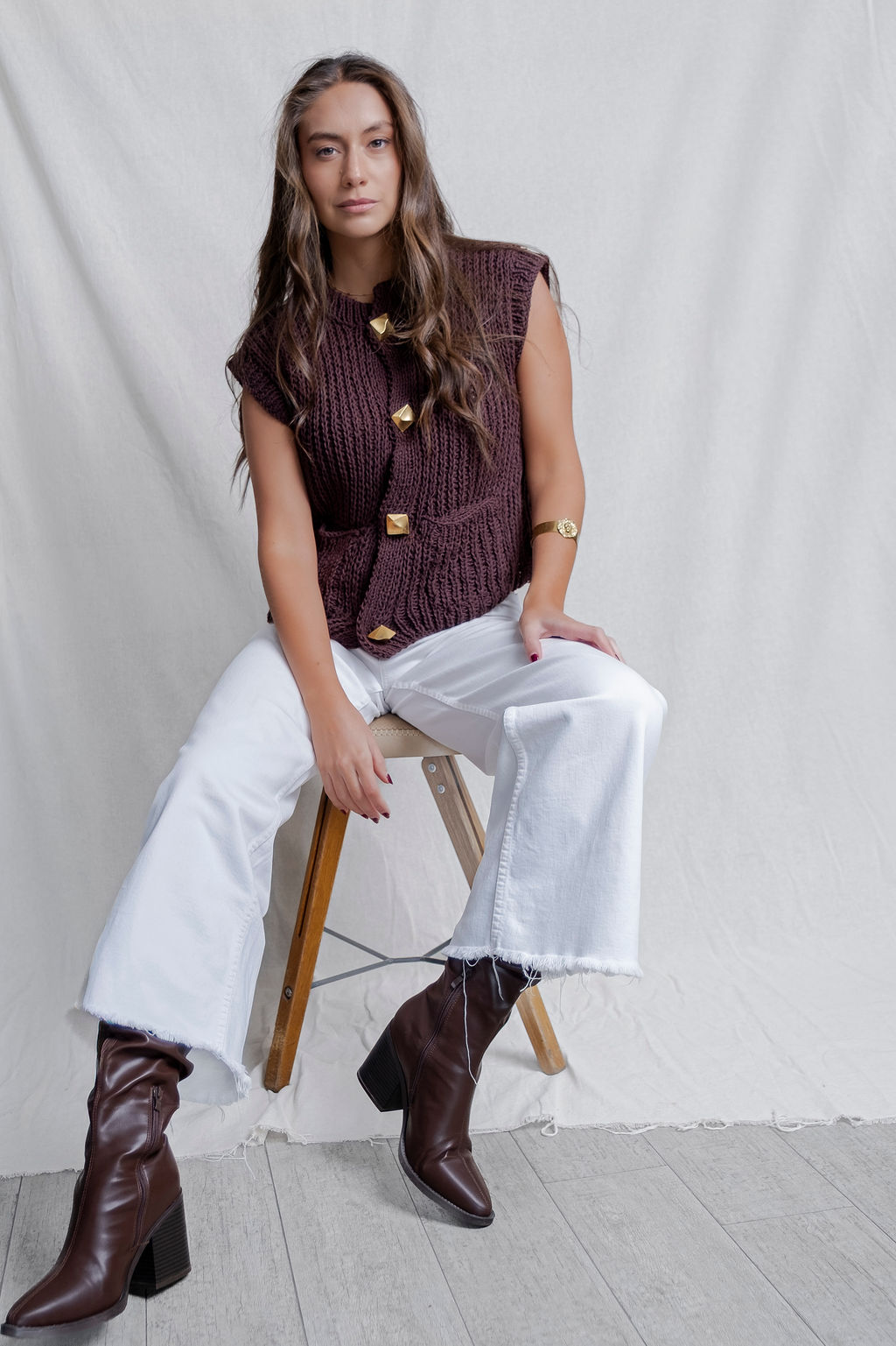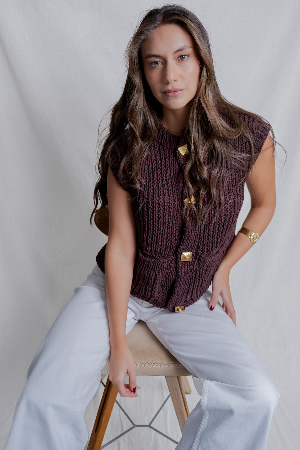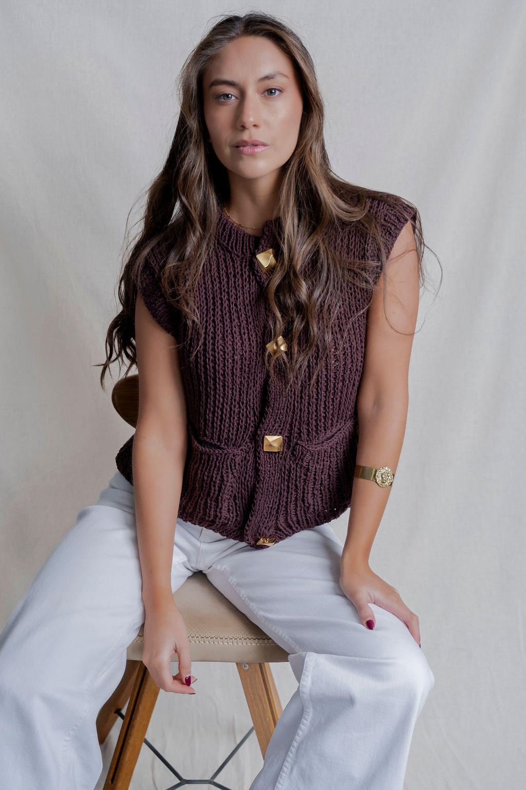 Tejido a mano con calma y propósito, este chaquetón sin mangas en algodón color marrón profundo se inspira en la fuerza silenciosa de los árboles. Los botones dorados evocan la luz del sol y los bolsillos aportan funcionalidad a una silueta libre, elegante y natural.